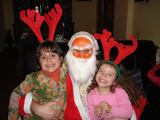 Quando chegou a altura de dar as prendas, expliquei às pequenas que o Pai Natal me tinha pedido para eu ligar uma luz no telhado para ele saber onde era a minha casa e que tinha de ir verificar se estava tudo a funcionar bem. Mudei de roupa em segundos e meti uma caraça made in China que imitava a sua figura na perfeição. Quando gritei Ho! Ho! Ho! e apareci na porta da sala, o ar de espanto na carinha da Maria como que a dizer “querem ver que é mesmo o gajo!” fez tudo valer a pena. Claro que a Leonor não perdeu um segundo a desmascarar-me e no fim valeu a risada geral. Foi bem!