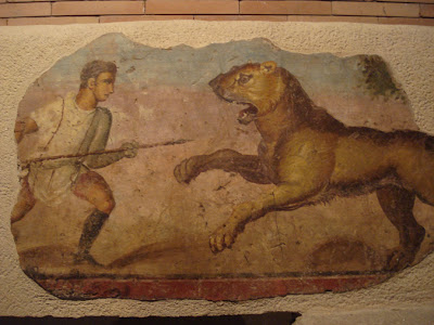 A Casa é magnífica e podemos por ali perfeitamente entender como seria uma “villae” romana, com as suas diversas e bem definidas divisões, o pequeno jardim interior, todas as pinturas decorativas, os magníficos e irrepetíveis mosaicos, a zona termal com os diversos tanques, o pórtico de entrada, a zona de estudo e tudo mais. Vejam bem que os gajos até se deram ao luxo de desenhar um Cupido com uma pombinha nos braços no chão do quarto que era assim mais para o namoro. Cheios de estilo. Epá! Adoro! Chegavam lá e diziam assim: “ó filha, olha só o que eu mandei fazer a pensar em ti” e era garantido! Espertalhões, sim! Porque nós, dos romanos, não ficámos só com o latim, os princípios básicos do direito e o gosto pela frequência dos lugares públicos. Na verdade, nós devemos muito mais a estes tipos que se vestiam assim só com uma farpela por cima e eram peritos em técnicas de engate e naquela altura marchava tudo fossem cachopinhos ou cachopinhas, velhas e velhos e até uma lucerna eu lá encontrei com a uma senhora a cometer acrobacias sexuais creio que era com um cavalo ou um gafanhoto gigante de patas para o ar que ali valia tudo. Eram grandes, estes romanos!