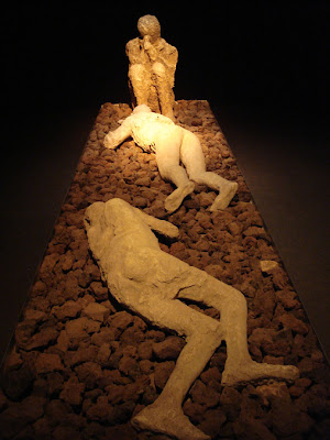 Querem mais? A cereja no cimo do bolo… a jóia mais bela da coroa: uma exposição temática com o sugestivo título: “Pompeia e Herculano: à sombra do Vesúvio”. Eh, eh. Lá dentro? Logo à entrada, três módulos de gesso que representam ao milímetro, três dos muitos corpos que foram encontrados naquelas paragens, três do que sucumbiram aos gases tóxicos e foram soterrados em cinzas vulcânicas. Depois? Quadros, esculturas, textos, artefactos de uso pessoal, vidros, frescos, utensílios de cozinha, mobiliário em bronze, instalações multimédia para explicar melhor o que se passou, divindades, amuletos, cerâmicas, tudo, tudo vindo de Nápoles, emprestado pelos amigos italianos. Ah! Música. Pura poesia.