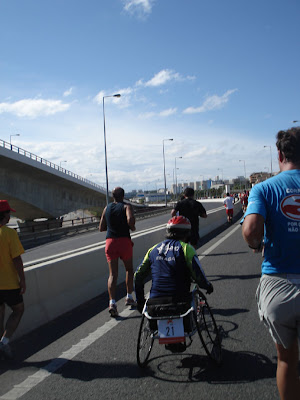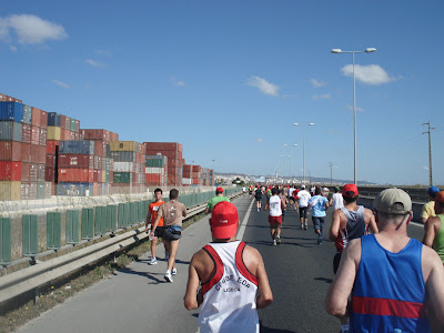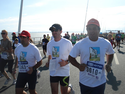 E dei-lhe bem, caraças! Depois do meio da prova, quando virei para Lisboa outra vez, fartei-me de ultrapassar pessoal e tantos, tantos artistas daqueles todos XPTO, com equipamentos todos pipis e cheios de barras energéticas e alta tecnologia. Tanto gajo que passei, tantos de perna rija, que corriam em grupos, com camisolas de mil e uma outras maratonas e eu ali em 5ª velocidade e prego a fundo na minha estreia. Foi muito bom!