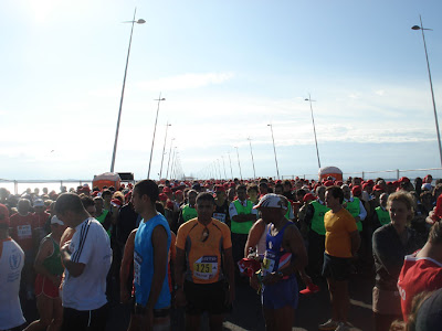 Minutos depois e lá íamos nós, todos enlatados, até à linha inicial. Os participantes distinguiam-se à partida pela cor dos dorsais: os rosas para a mini-maratona de 8 quilómetros e os azuis para a prova rainha. Ali havia de tudo desde gajos com muita pinta de atleta, velhinhos rijos, a mães e filhos… enfim, mesmo de tudo um pouco.