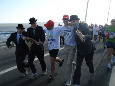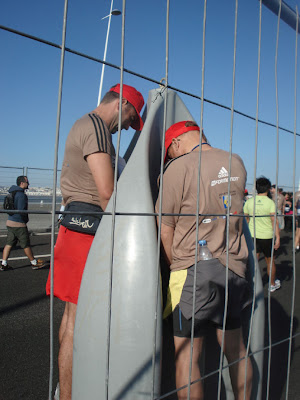Chegados a Lisbon city dentro do horário estabelecido e depois de devidamente equipados (cortesia do nosso amigo Felino), lá rumámos à Gare do Oriente, onde milhares de pessoas se enfilavam a caminho dos autobuses da Carris que faziam o favor de encaminhar a populaça para o quilómetro 7 da ponte, de onde partimos. Já ali dava para avistar alguns interessantes exemplares da fauna cómico-citadina, como um palhaço trajado a rigor que encabeçava a parada.