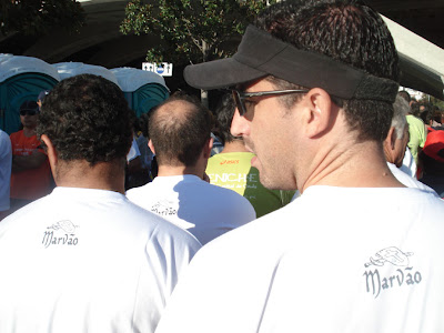 Lá chegados, já um magote de malta aguardava engaiolado dentro das baias pelo tiro de partida. Andámos, andámos e a certo ponto, uma barreira separava os participantes da mini dos da meia. É claro que dos cerca de 18 mil participantes, a grande maioria enfiou pela via da esquerda. Assim que entrámos pela direita, muito mais estreita, era impossível um gajo não se achar assim importante, sobretudo quando via os parceiros do outro lado da grade a olhar para nós como se fossemos autênticos olímpicos, tipos que são capazes de fazer aquilo que lhes está ao alcance só em sonhos. Isto faz um bem ao ego…