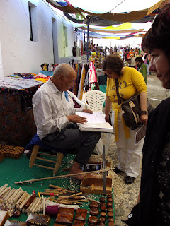 Em Marvão temos o cuidado de seleccionar com critério posto a posto; privilegiamos aqueles que trabalham ao vivo e mostram a sua arte; temos a preocupação de ir variando os têxteis com as loiças, as pratas com os brinquedos, as madeiras com a bijutaria e de ter zonas específicas, por exemplo para as crianças e para a alimentação; temos o cuidado de apertar com os expositores para se vestirem a rigor e para serem pontuais. Nada disso vimos ali. Antes vi pessoas de jeans a venderem velharias e mel, e electricistas a fazerem montagens em cima da hora da abertura.