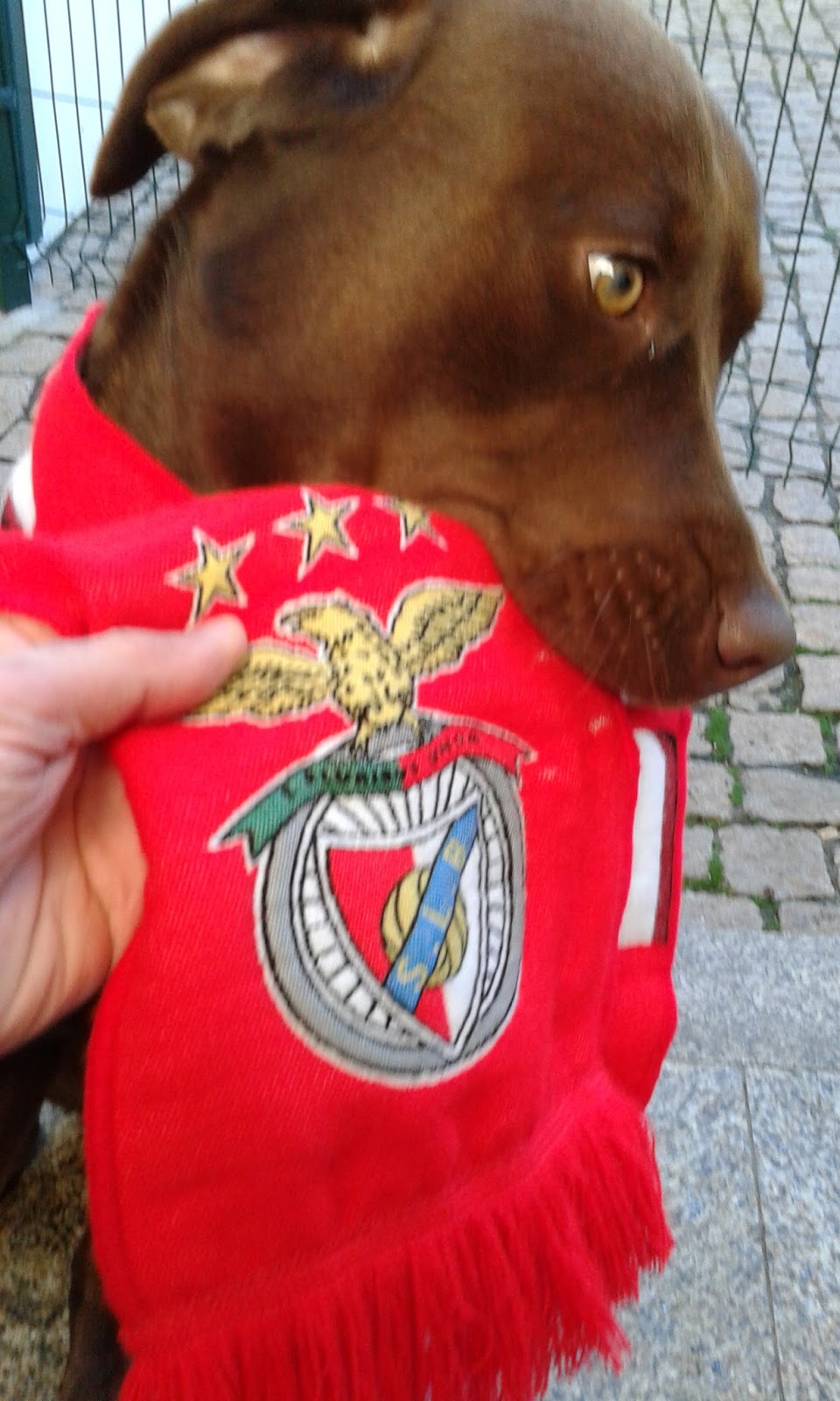 | Sizzle, o cão, a aprender qual é o clube do coração. Até o morde! |